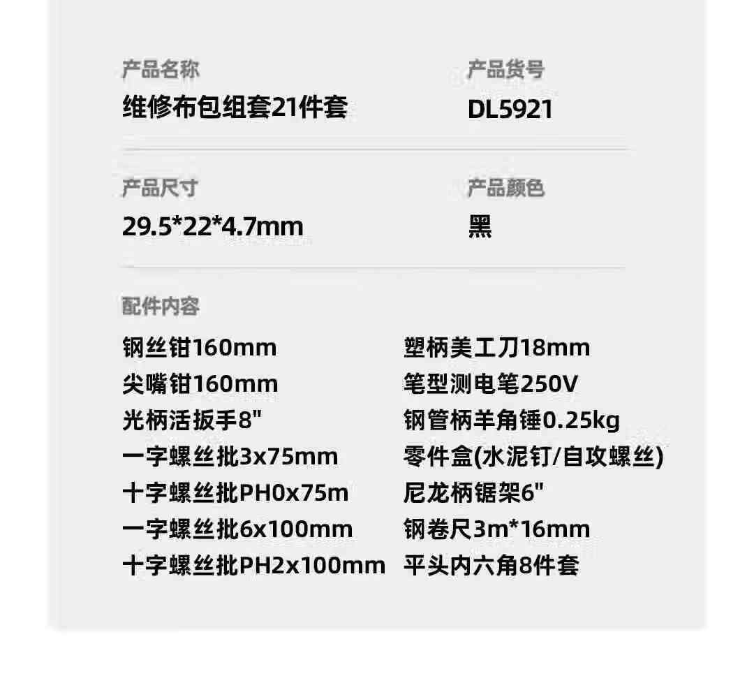 商品名稱:得力DL5921 家用工具箱套裝 布包組套電工木工維修五金手動(dòng)工具21件套