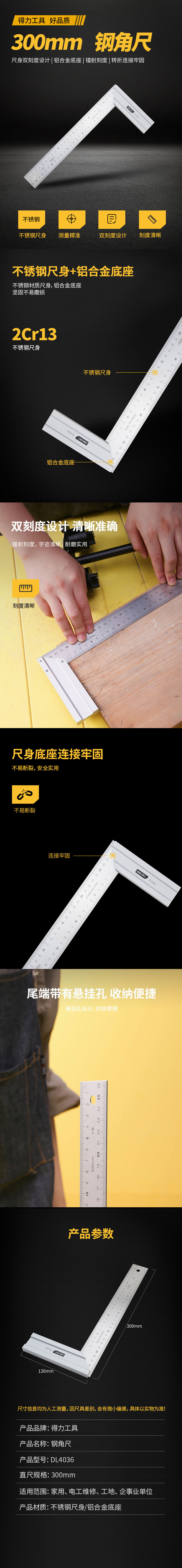 商品名稱:得力DL4036 鋼角尺 不銹鋼直角尺雙刻度角尺測量方直尺木工尺子300mm