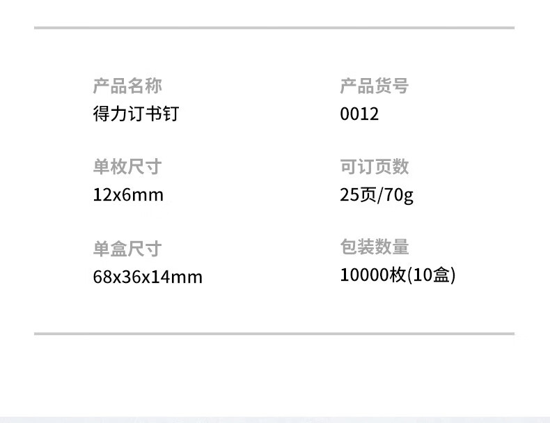 商品名稱:得力0012 高強(qiáng)度訂書(shū)釘 12#訂書(shū)針 1000枚/盒 10盒裝 辦公用品