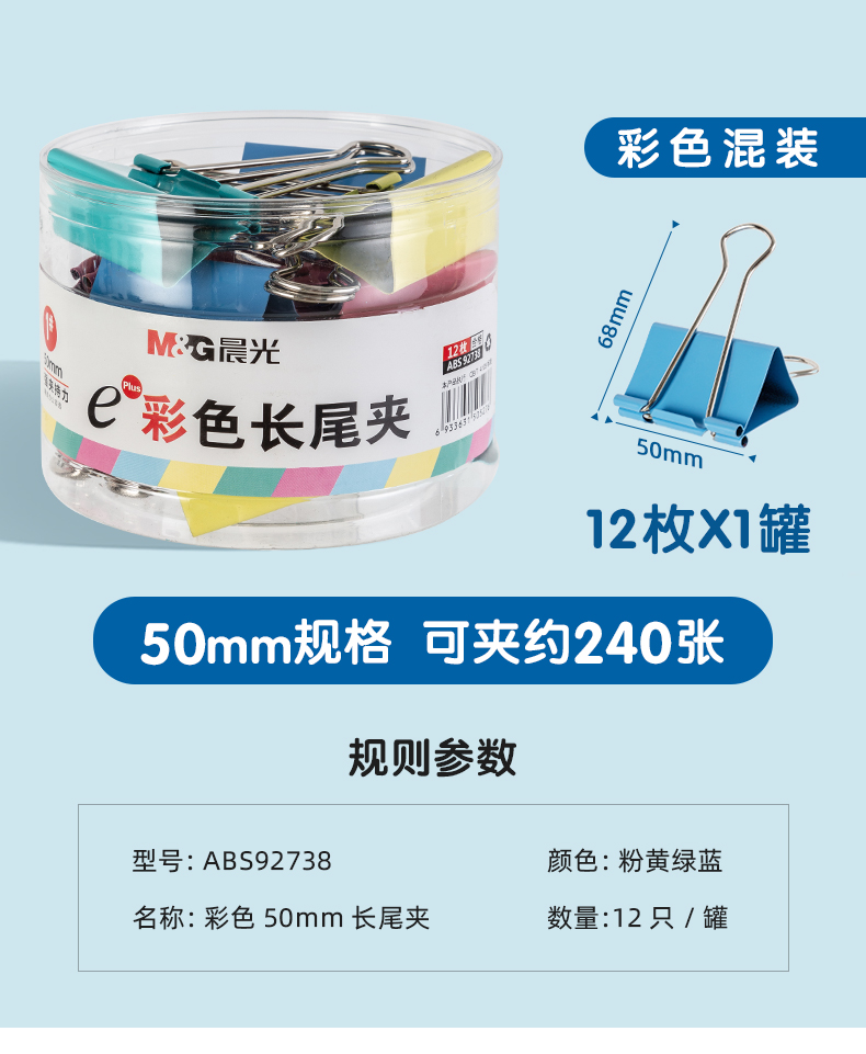 商品名稱:晨光ABS92738 彩色長(zhǎng)尾夾 50mm金屬票據(jù)夾 Eplus系列辦公燕尾夾 12只/罐
