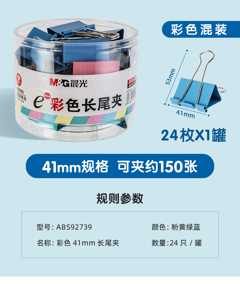 商品名稱:晨光ABS92739 彩色長(zhǎng)尾夾 2#41mm大號(hào)金屬票據(jù)夾 Eplus系列辦公燕尾夾 24只/罐