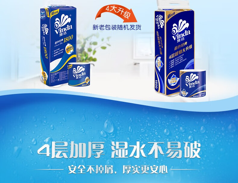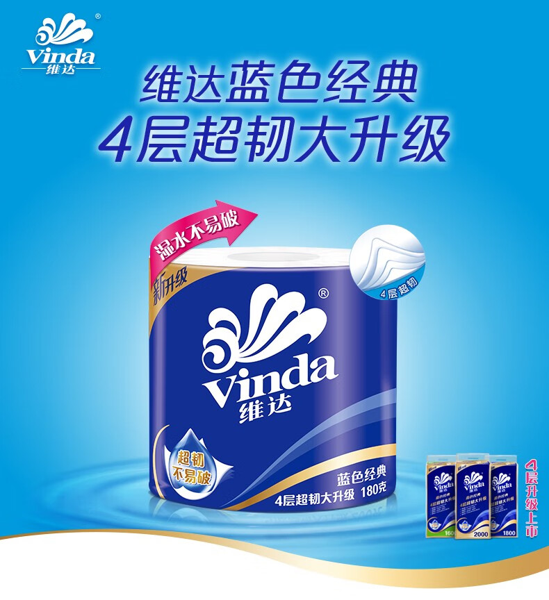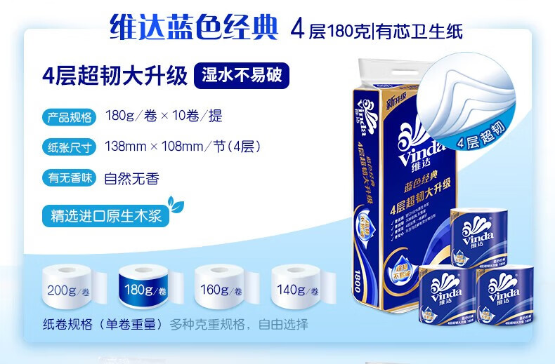 商品名稱:維達V4028 藍色經(jīng)典系列有芯卷紙 家用廁紙衛(wèi)生紙 4層180克*10卷/提