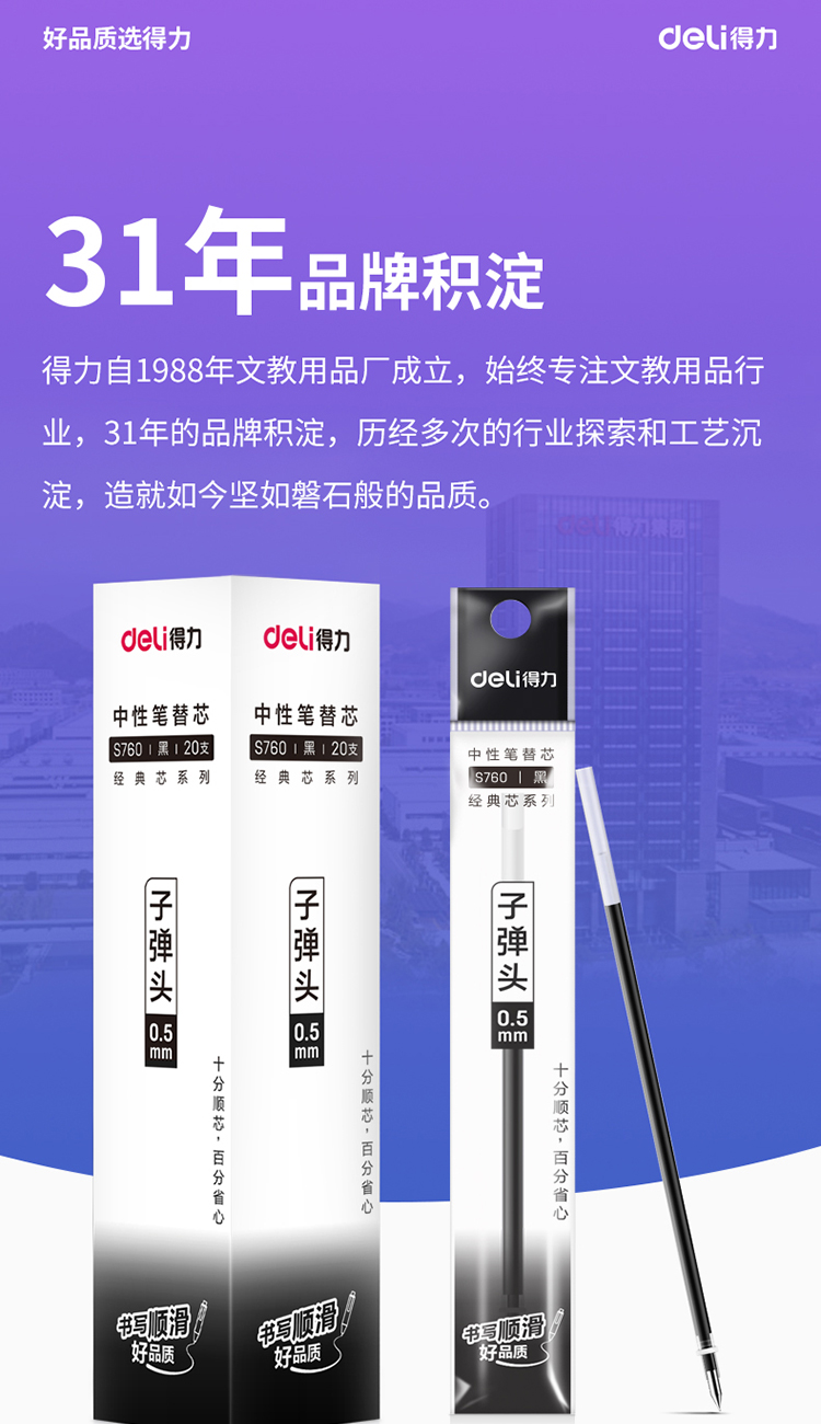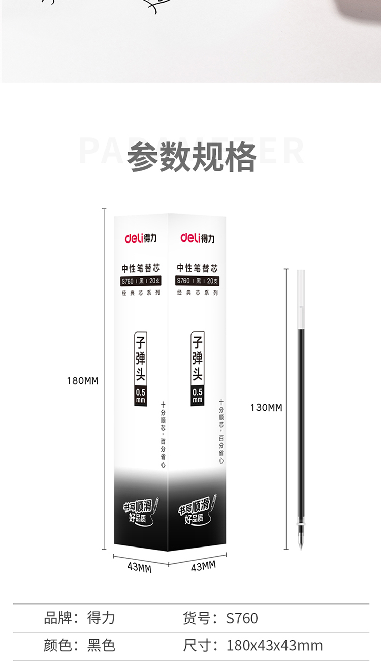 商品名稱:得力S760 中性筆筆芯 辦公書寫筆子彈頭0.5mm水筆芯 20支/盒