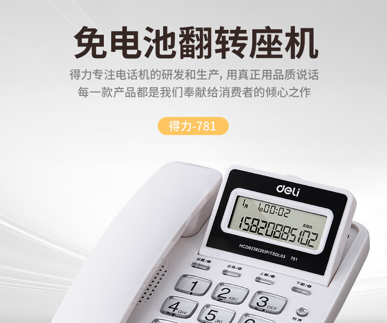 商品名稱:得力 電話機座機 固定電話 辦公家用 翻轉(zhuǎn)屏幕 免電池 781白