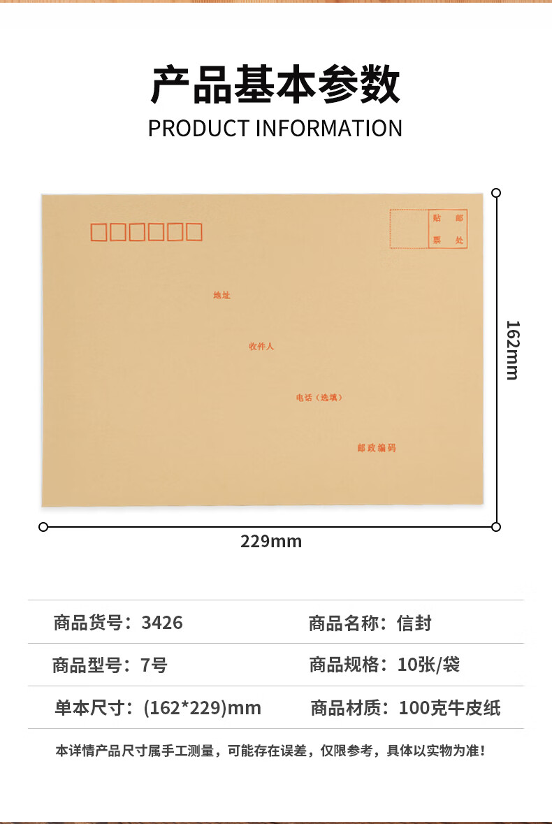 商品名稱:得力 3426 7號牛皮紙信封 郵局標準信封229*162mm 10張/包