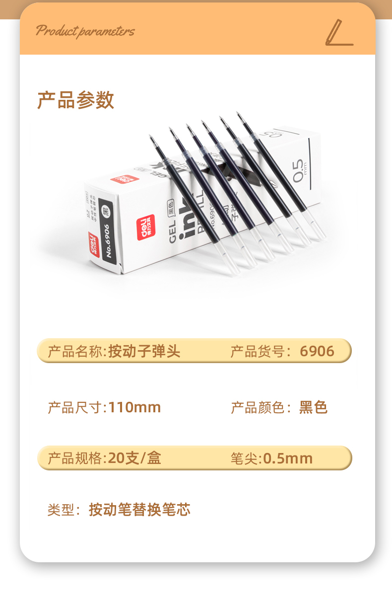 商品名稱:得力6906 按動中性筆芯 學(xué)生辦公水筆簽字筆替芯 0.5mm子彈頭 20支/盒