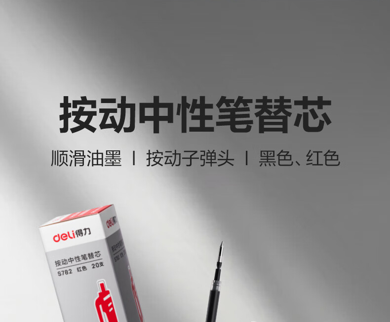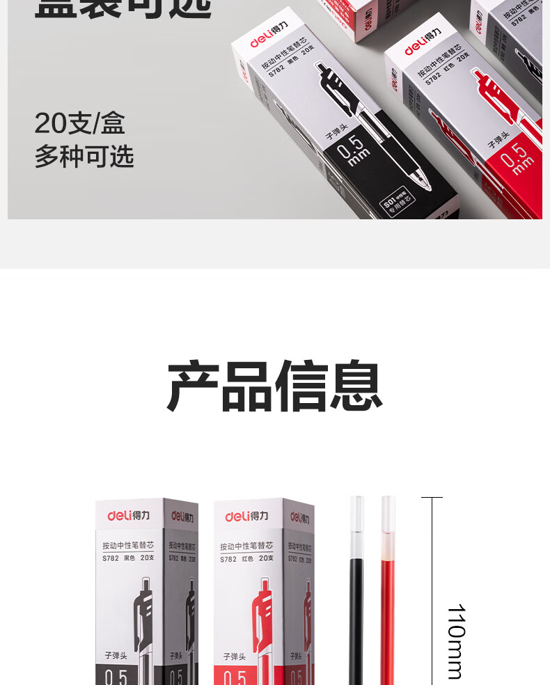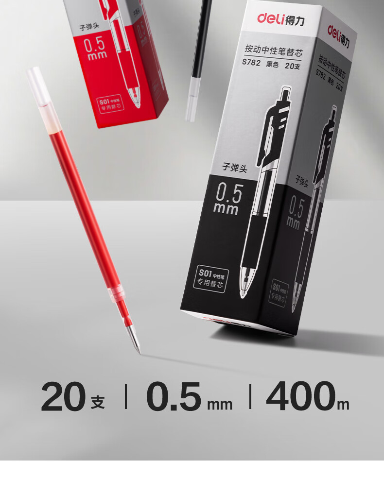 商品名稱:得力S782 按動(dòng)中性筆芯替芯 S01/S08/1008/K35適用 0.5mm子彈頭 20支/盒 辦公用品