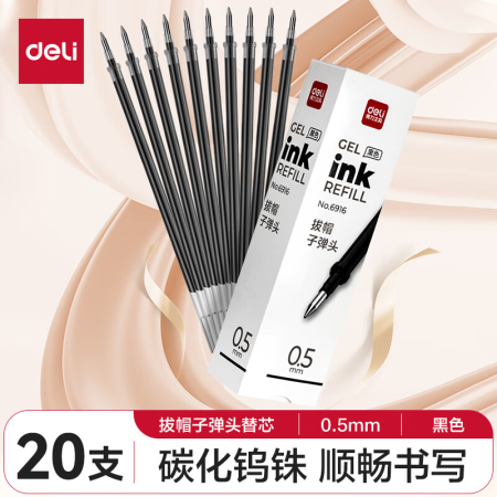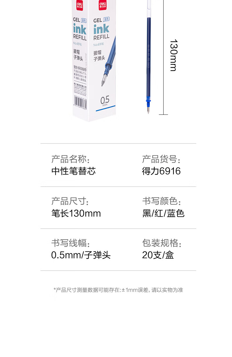 商品名稱:得力6916 中性筆芯 0.5mm子彈頭水筆簽字筆替芯 6600/34567/Q7適用 20支/盒