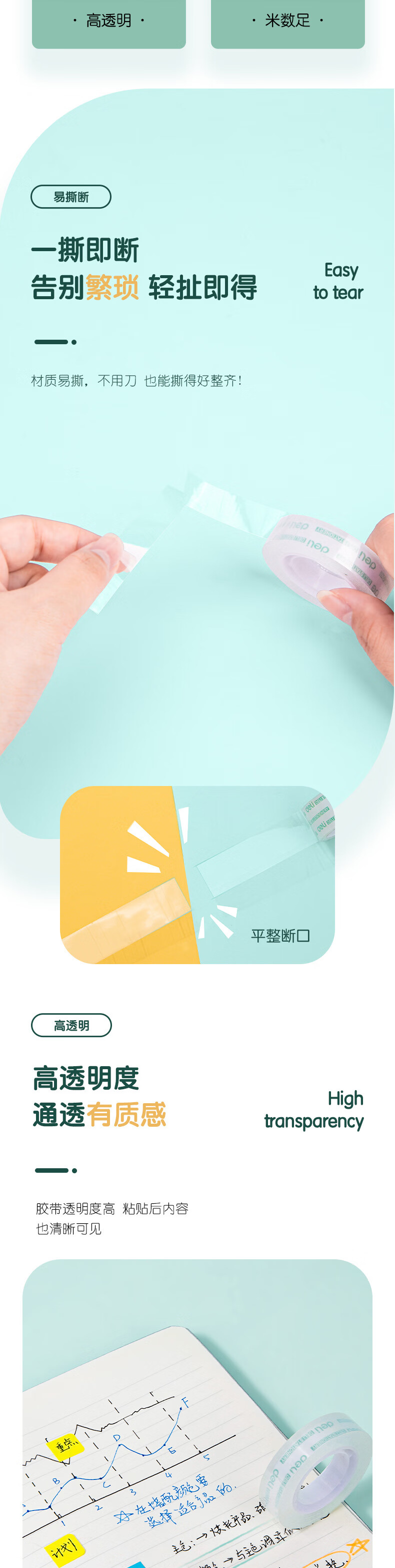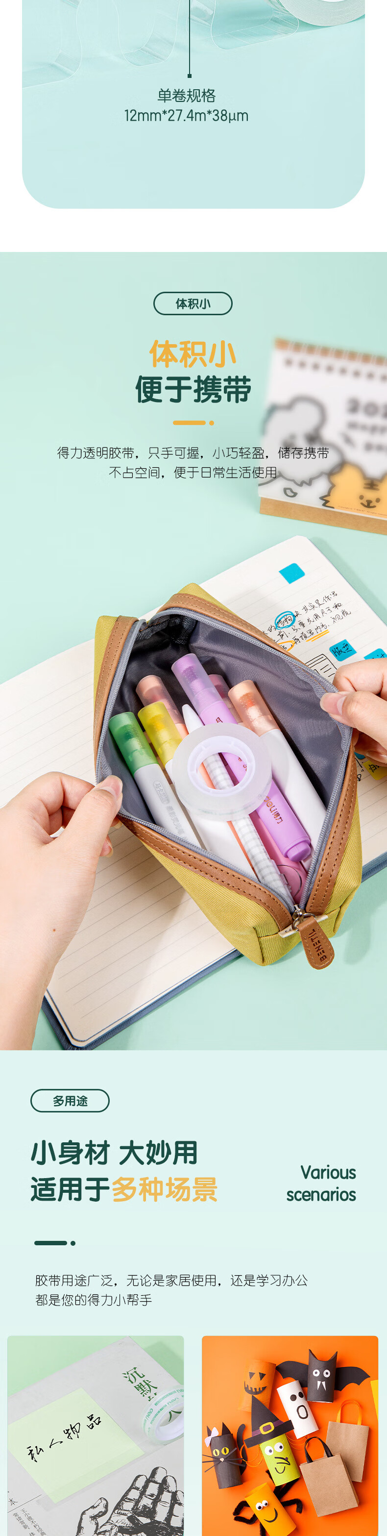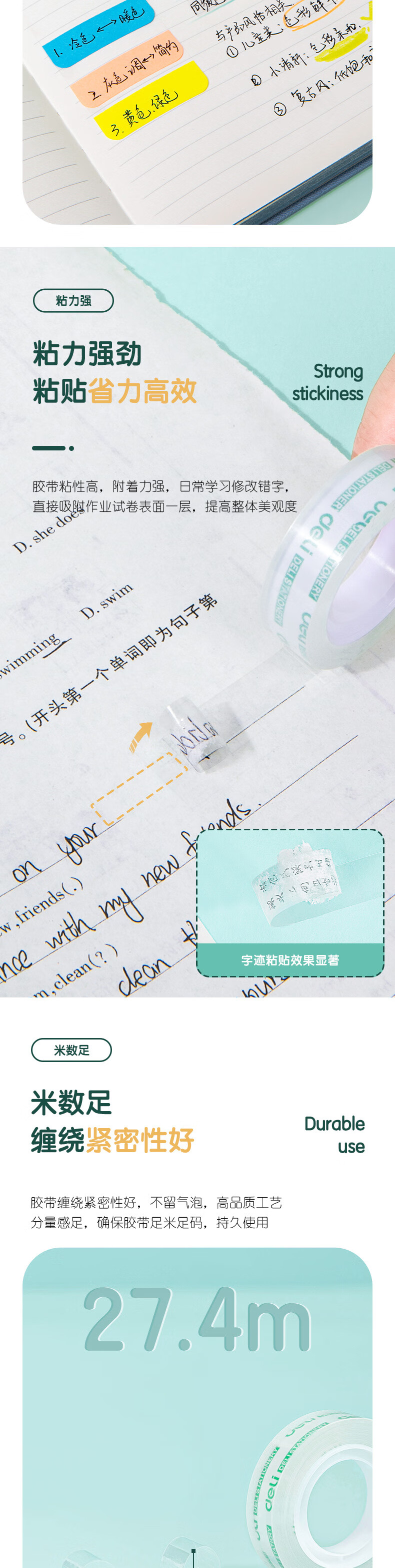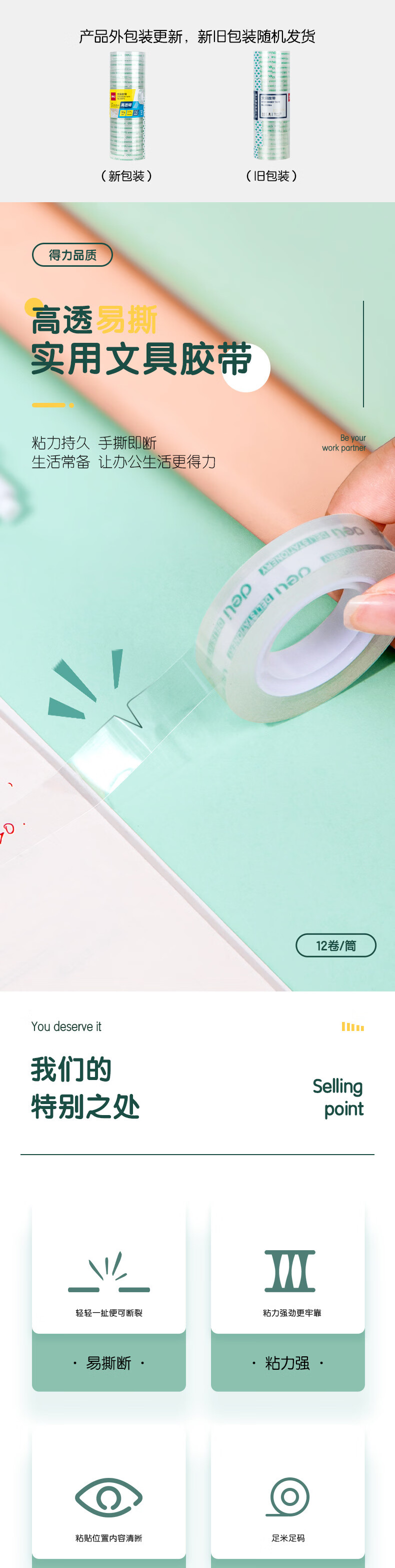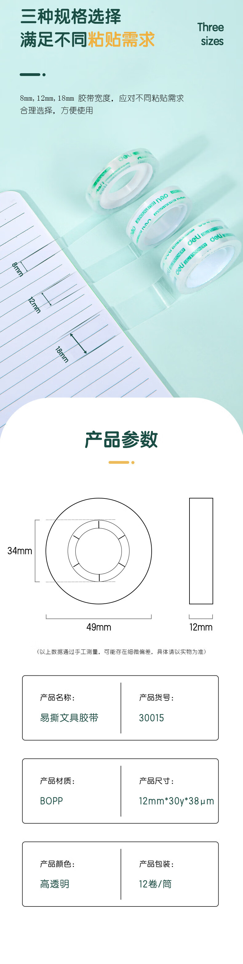 商品名稱:得力30015 易撕透明膠帶 高粘度小膠帶 12mm*30y(27.4m) 12卷/筒