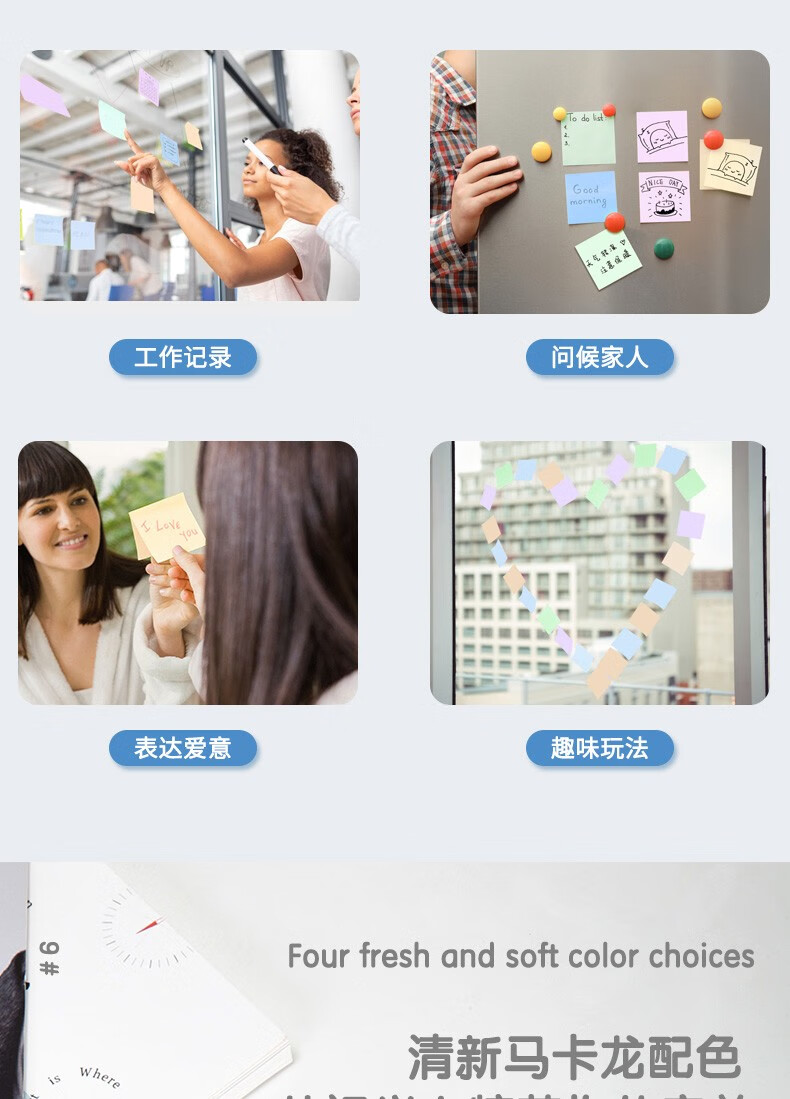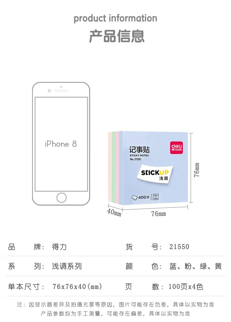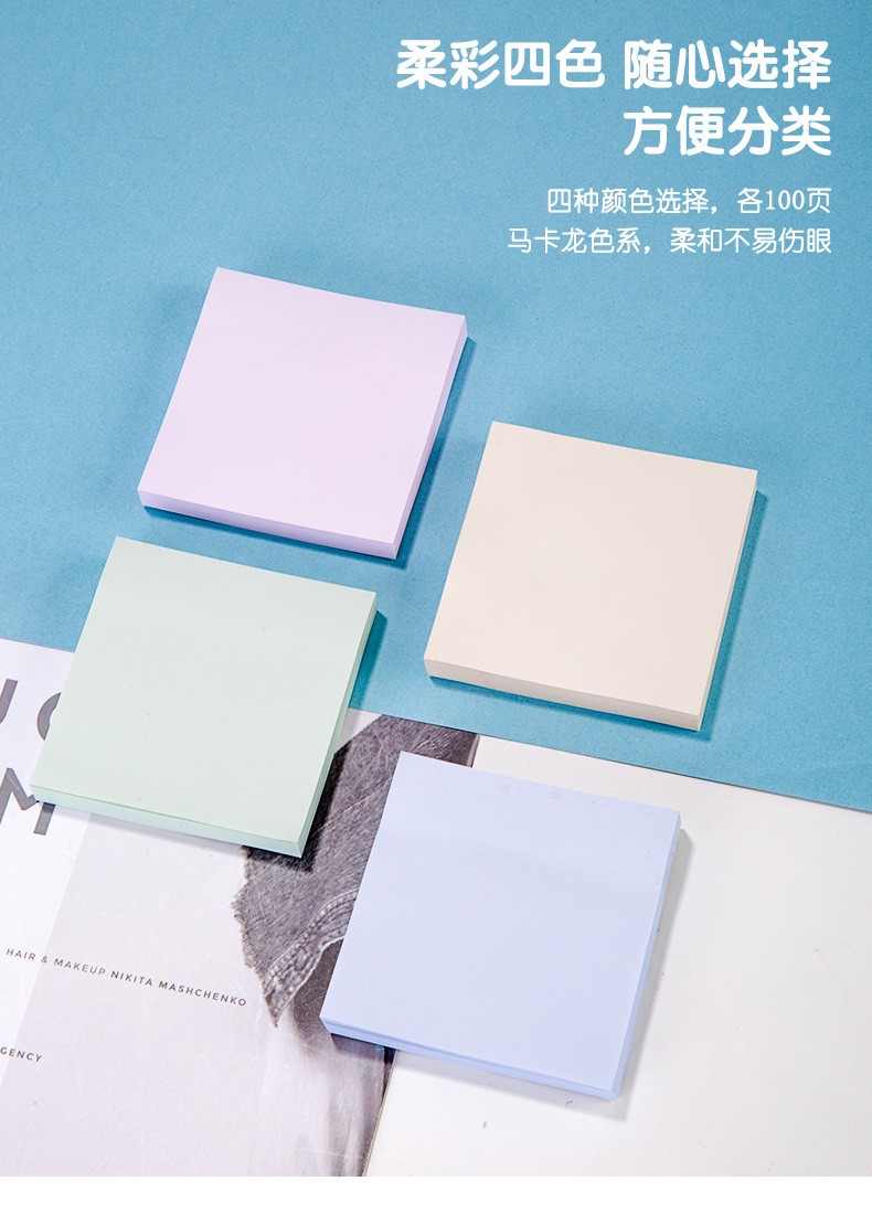 商品名稱:得力21550 便利貼 4色淺調(diào)系列淡彩簡約便簽本 76*76mm記事貼/自粘留言本 400張/袋