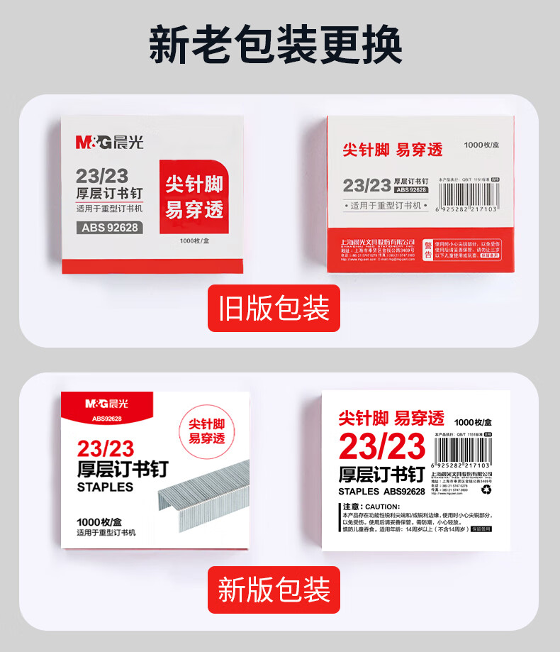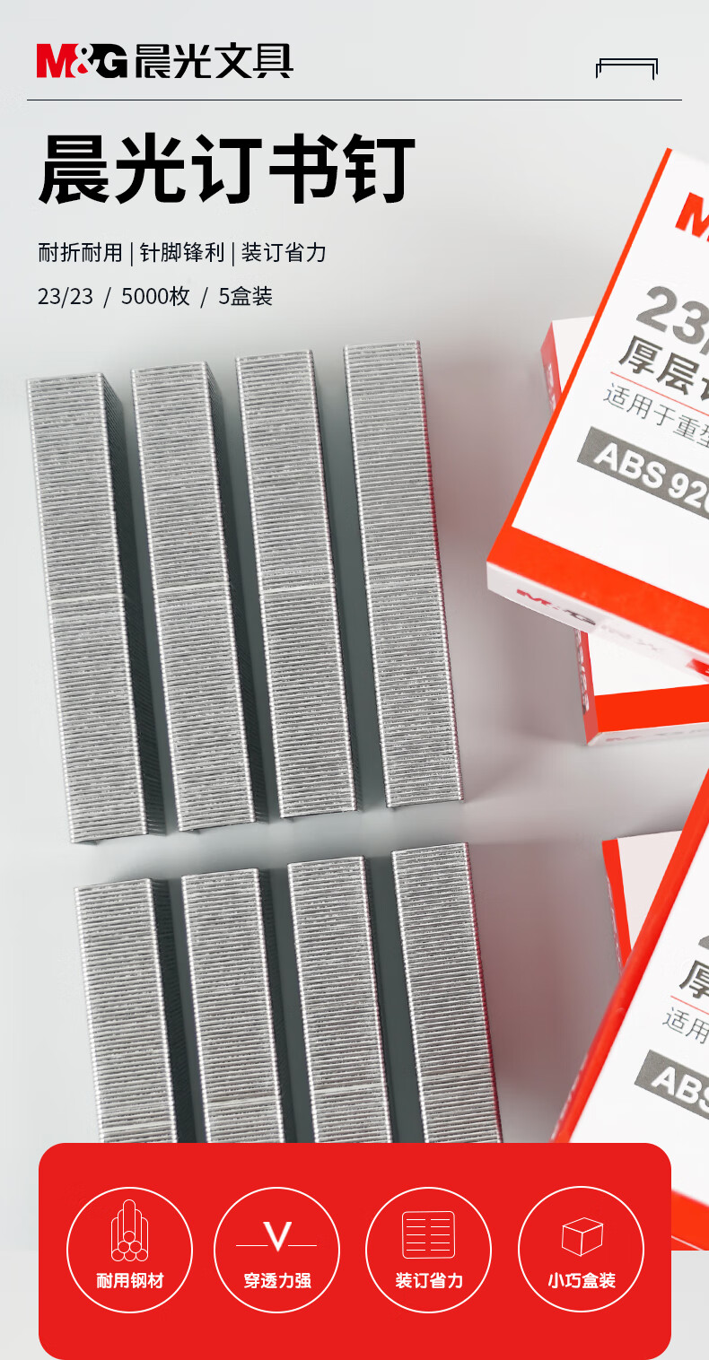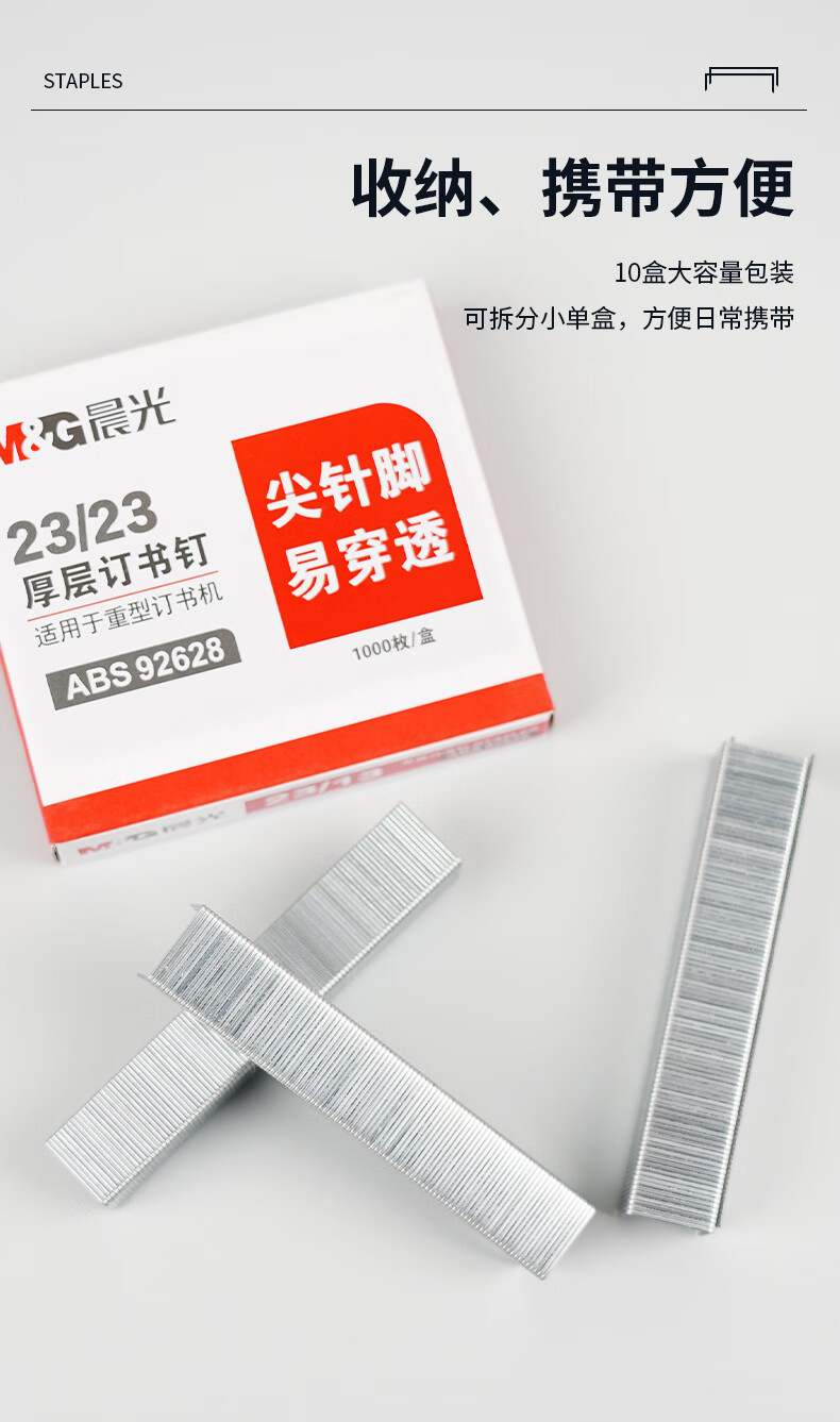 商品名稱:晨光ABS92628 訂書釘 23/23號厚層易穿透重型訂書針 辦公用品 1000枚/盒 5盒裝
