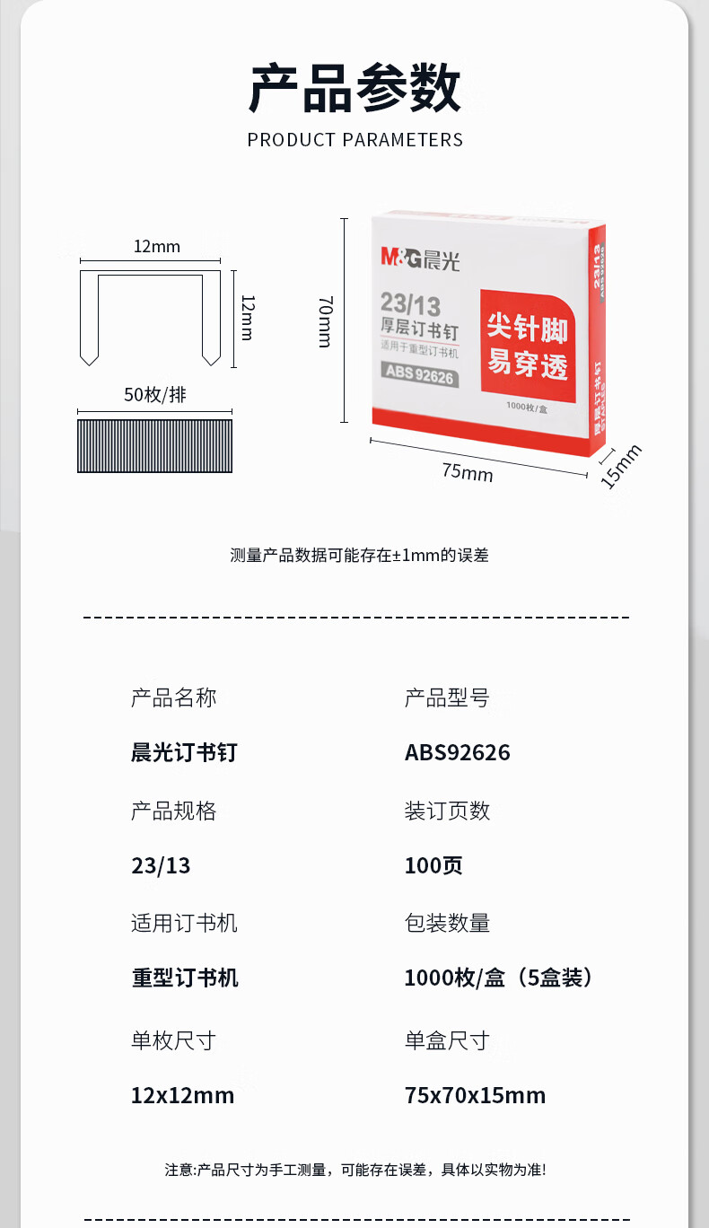 商品名稱:晨光ABS92626 訂書釘 23/13號厚層易穿透訂書針 重型訂書釘1000枚/盒 5盒裝