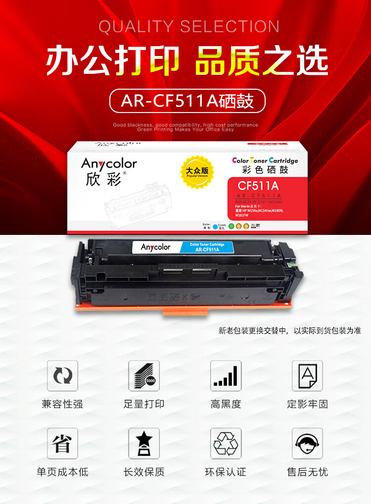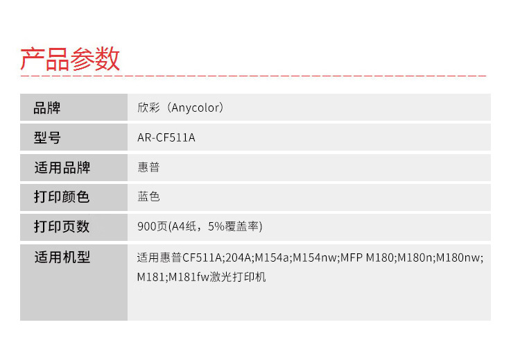商品名稱(chēng):欣彩AR-CF511A藍(lán)色硒鼓 大眾版 適用惠普CF511A 204A M154a M154nw MFP M180 M180n M180nw M181