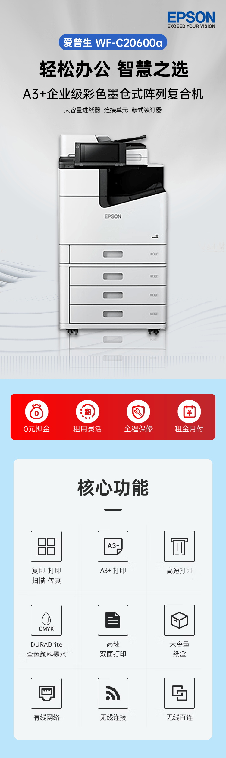 商品名稱:愛普生全新復(fù)印機租賃 茂名出租A3超高速彩色噴墨復(fù)合機(月)